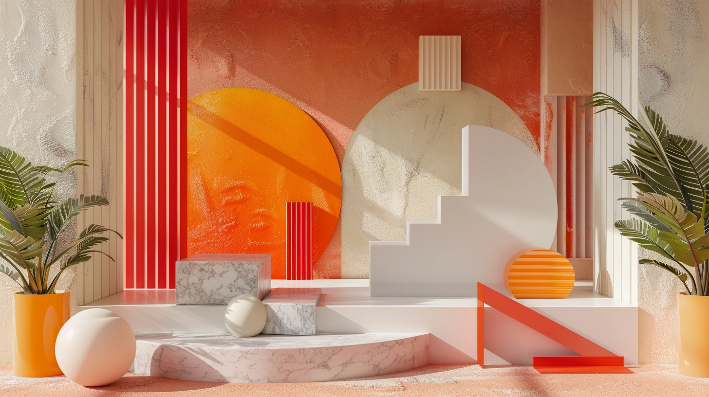 3d rendered podium with random geometrical shapes in plastic style 3d