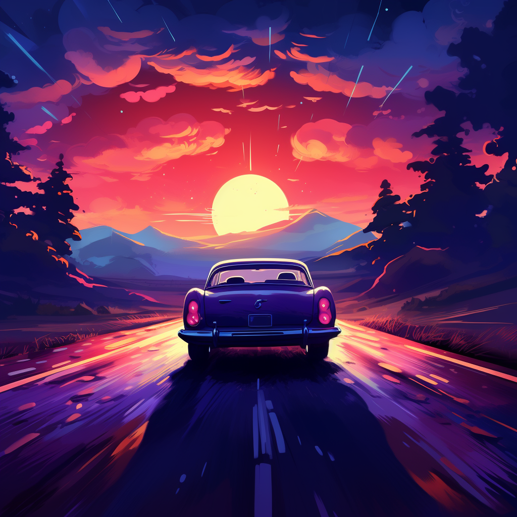 A beautiful illustration of a car driving at night d