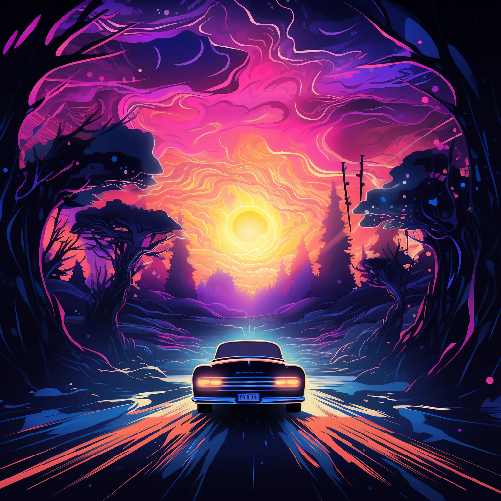 A beautiful illustration of a car driving at night d