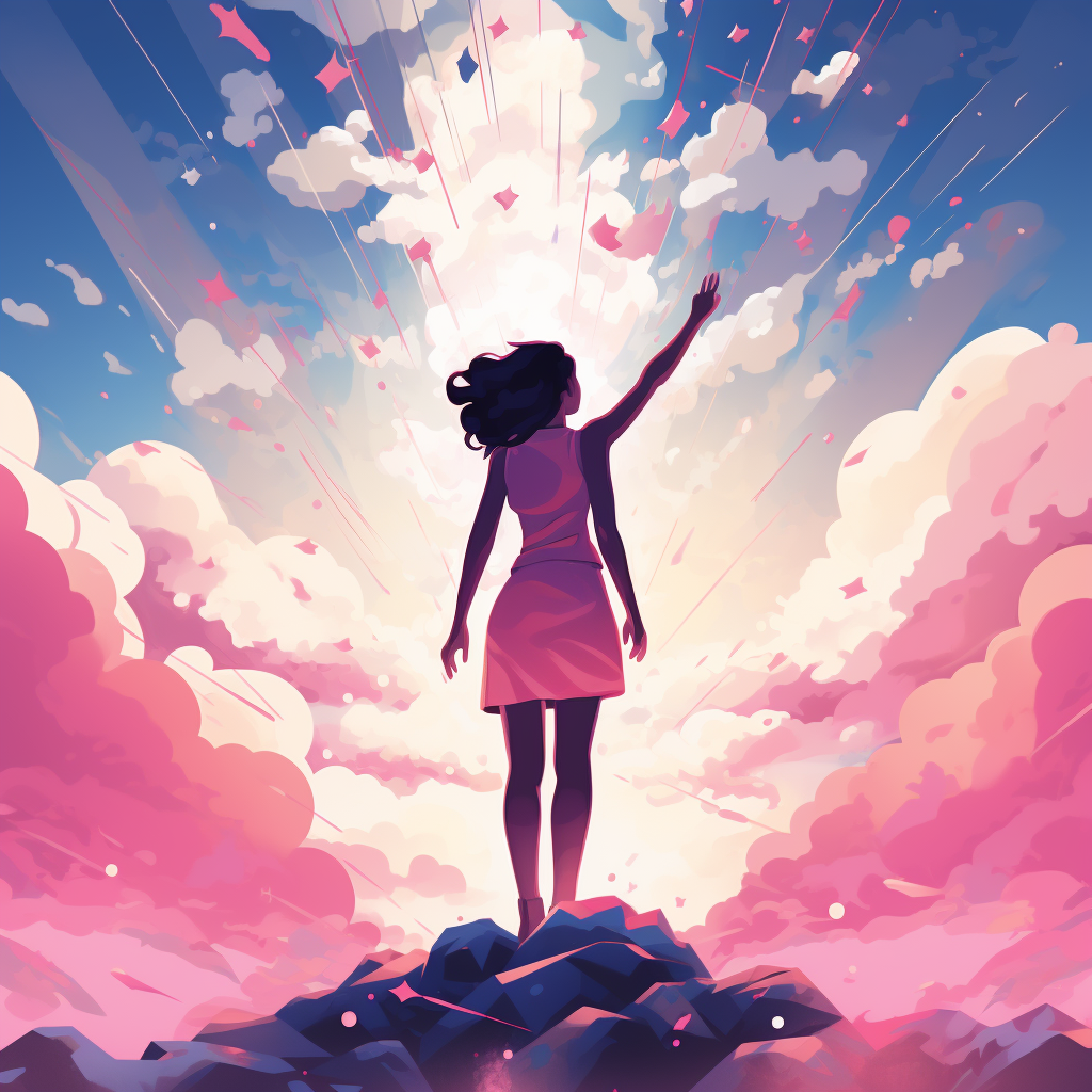 40 year old woman focal point, women at a women's corporate lunch event holding pens and notepads, smiling, wearing soft colours, grey and corporate style attire. Pastel pink napkins, pens and some vases as the table centerpieces. Women sitting at long dining room tables, the tables are full of women. The room is well lit, and there are salmon colored outdoor umbrellas visible outside of restaurant room. here are salmon colored outdoor umbrellas visible outside of restaurant room. daylight