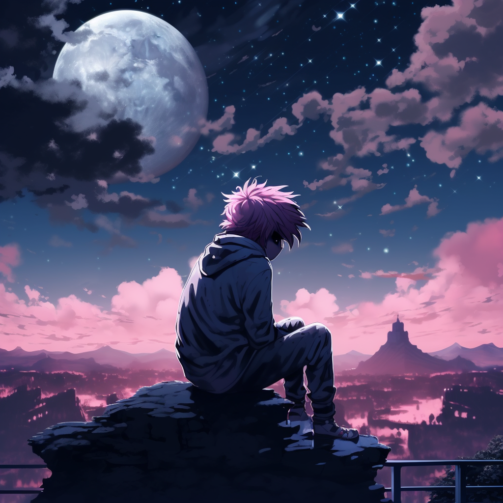 A boy sitting under the night sky with pink hair in