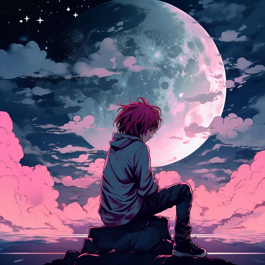 A boy sitting under the night sky with pink hair in