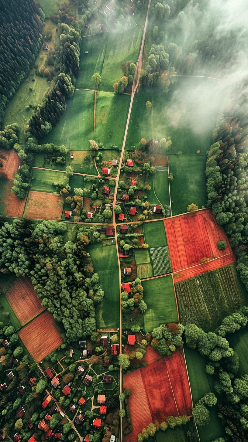 Aerial photo, rural farmlands, style like a painting by Mark Rothko