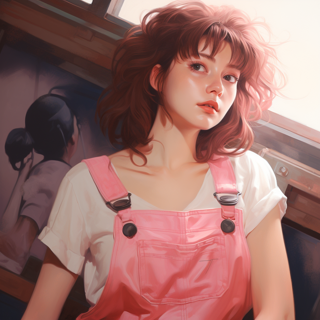 Anime girl dressed in pink overalls in the style of