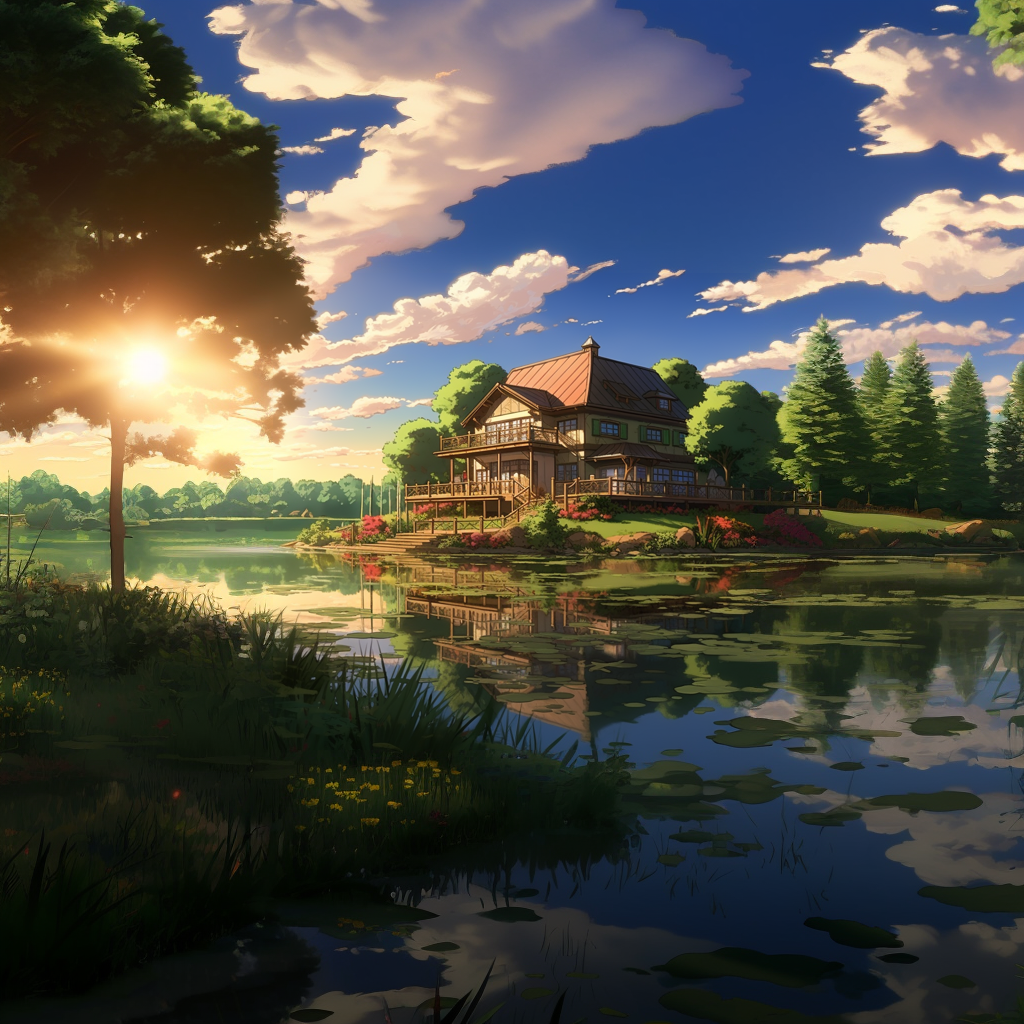 Anime lakehouse reflecting off of water HDR beautifu