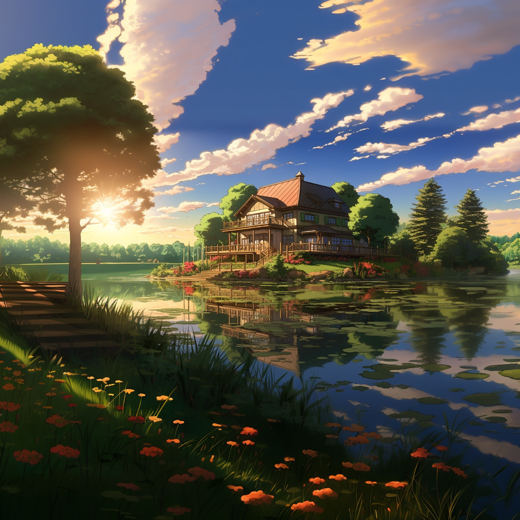 Anime lakehouse reflecting off of water HDR beautifu