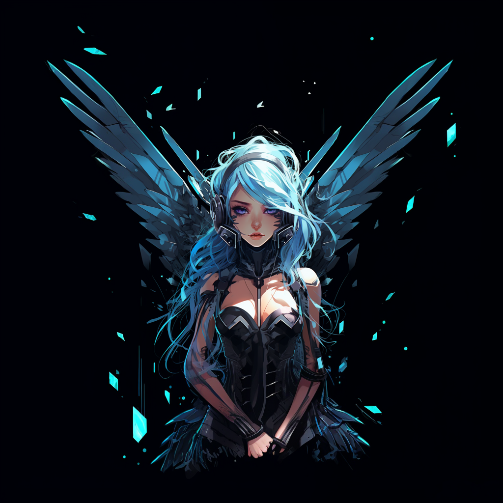 Cyberpunk anime fairy with blue hair and wings 2D ve