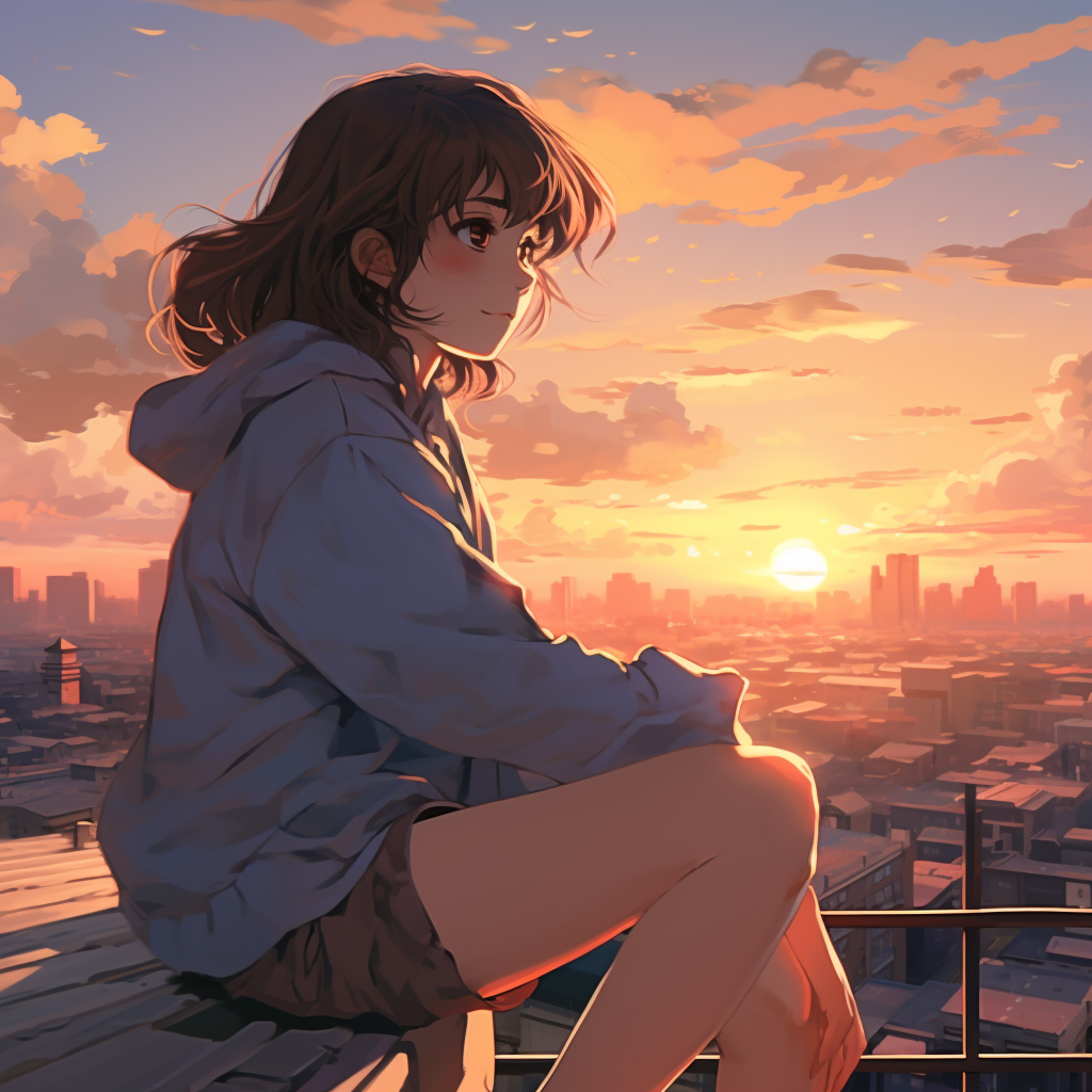 Girl sitting on the roof and watching the sunset in