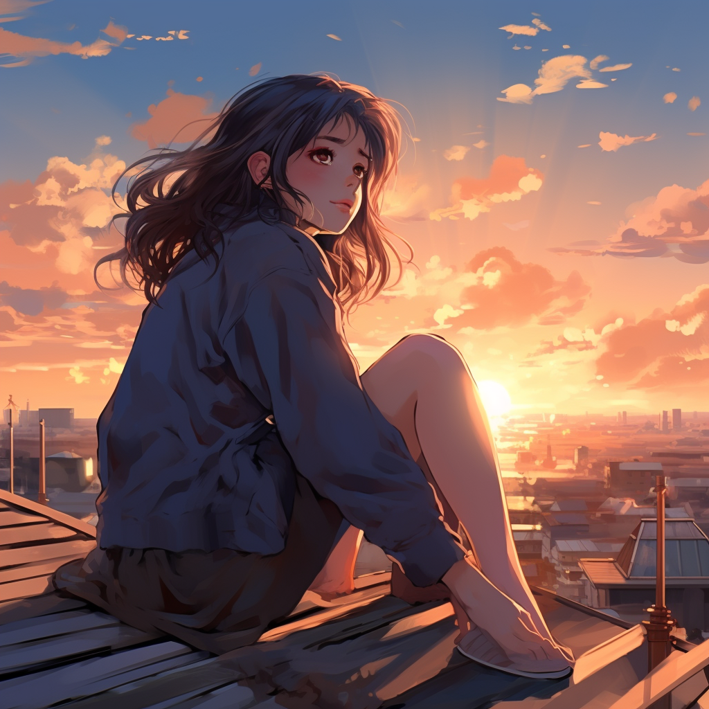 Girl sitting on the roof and watching the sunset in