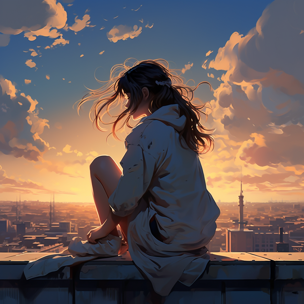 Girl sitting on the roof and watching the sunset in