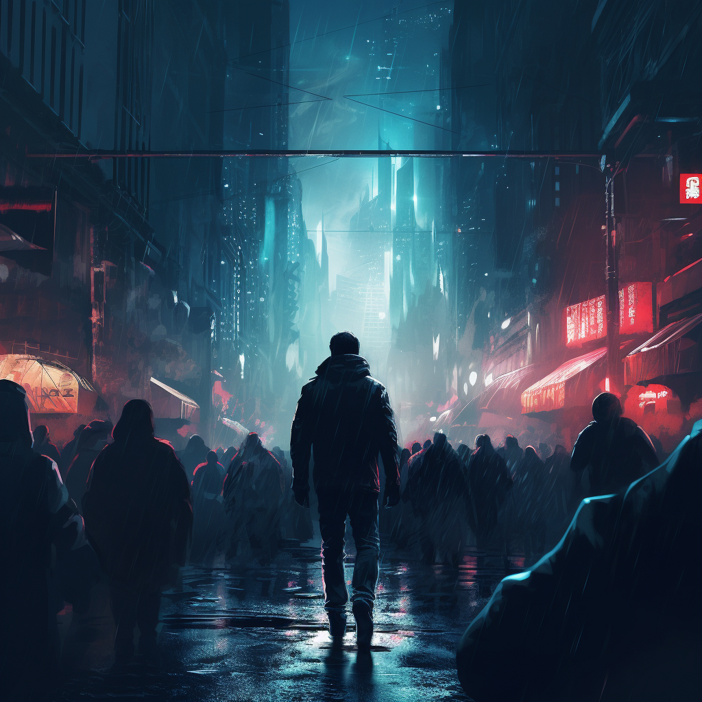 Man walking among people in darkness holding blue li