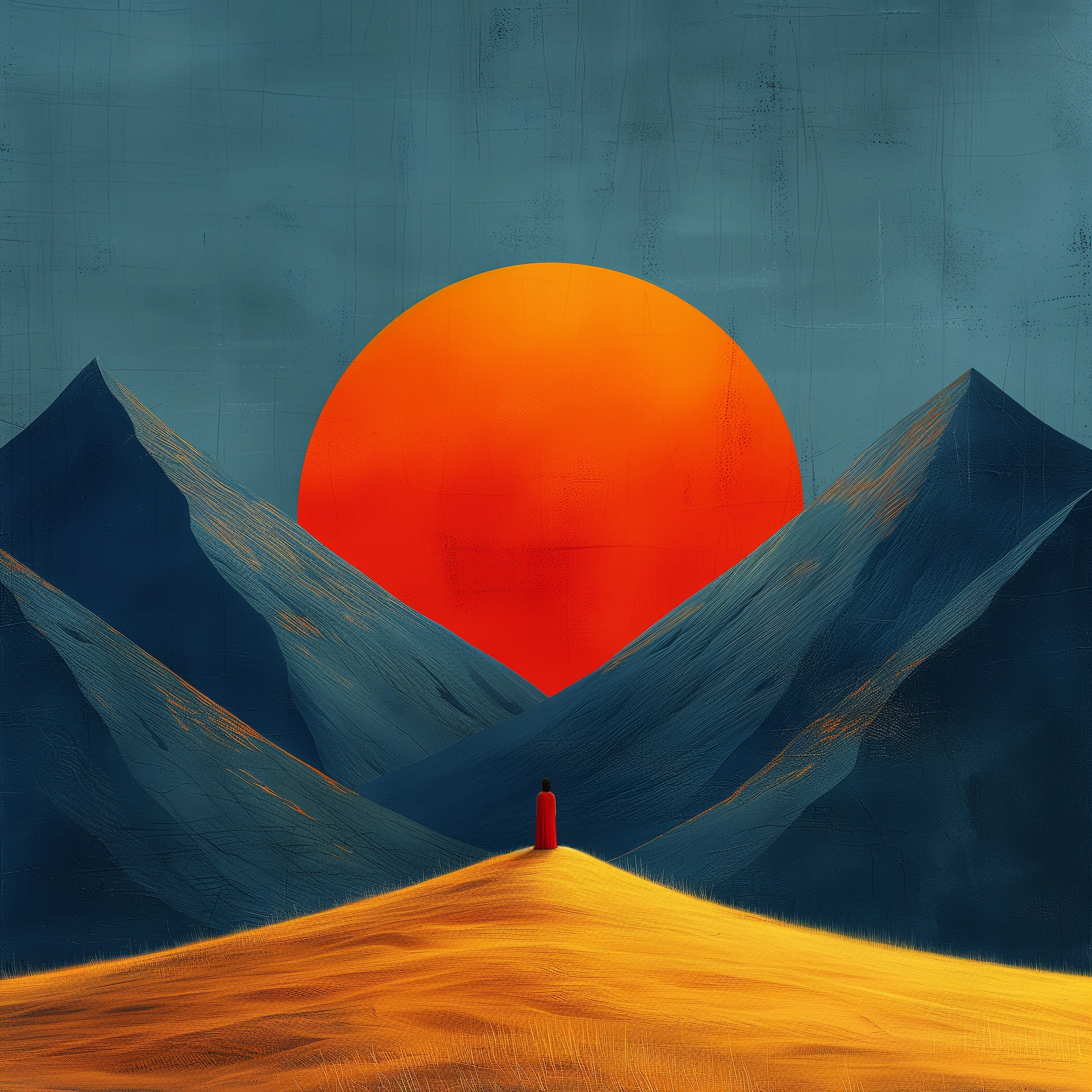 minimalism art, person, green grass, blue mountains, yellow shapes