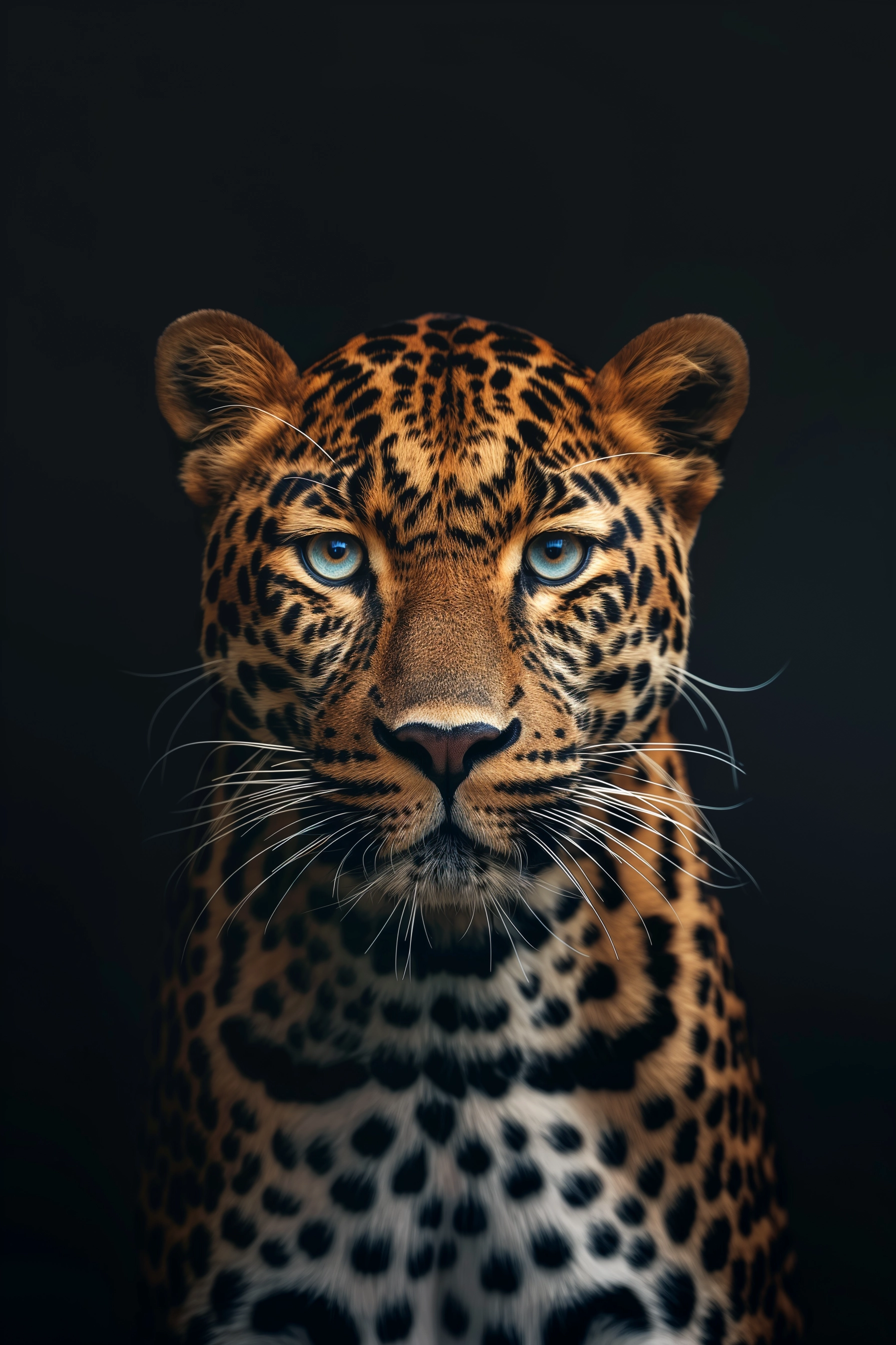 photography of a majestic leopard, front view, dark background