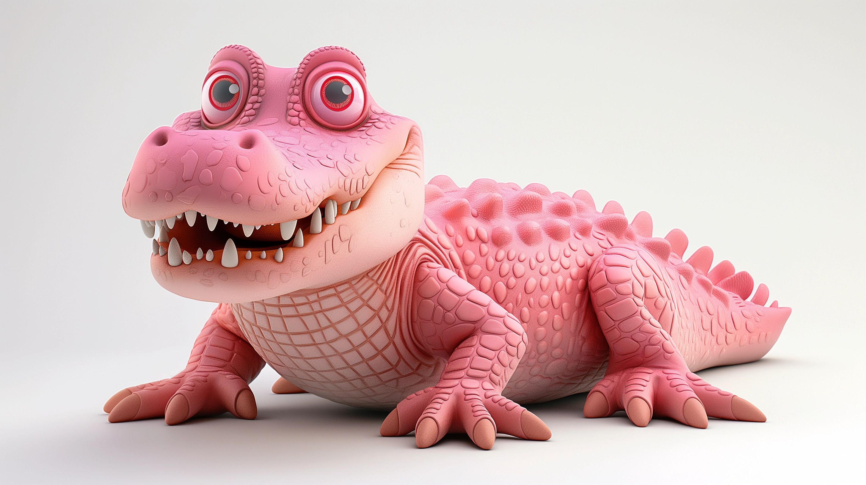 pink smiling crocodile on white background, pixar style, isometric perspektive