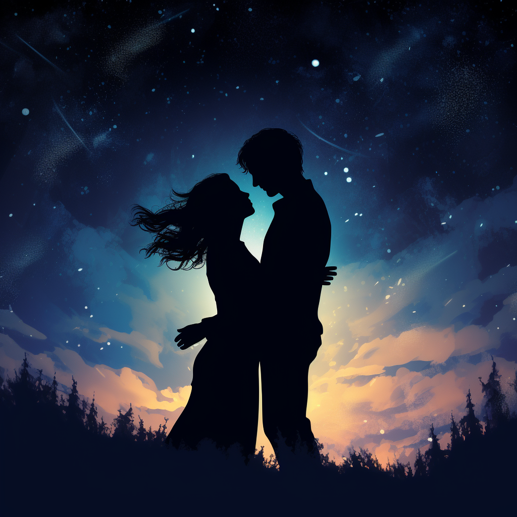 Shadow of a man and woman hugging a night sky styliz