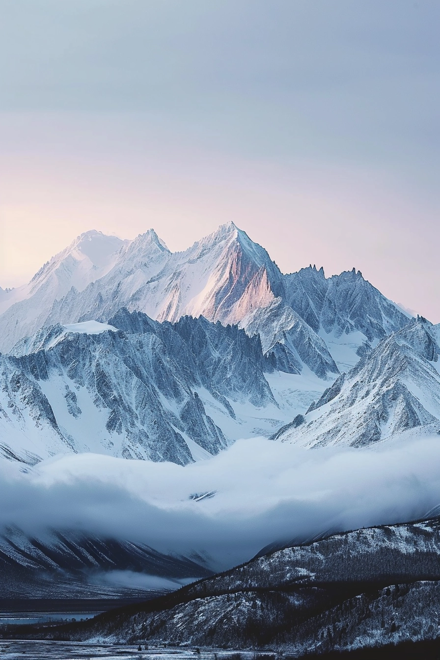 Stretching snow capped mountains, dusk, mist, sky, sunset feeling, ultra wide