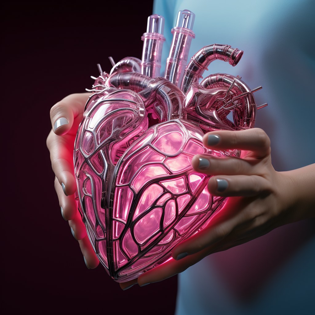 Synthetic heart being held in a robotic hand in the