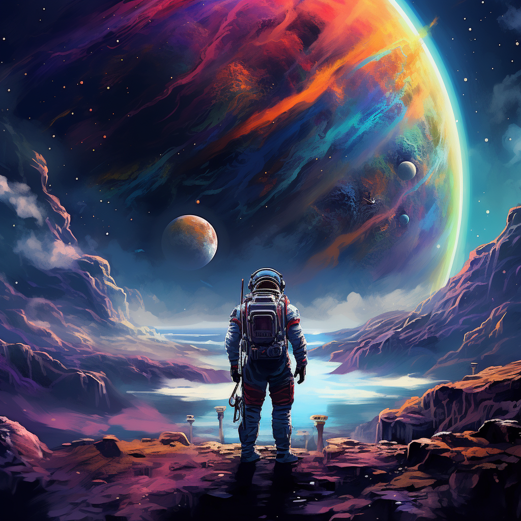 The astronaut looks out across the outer space in th